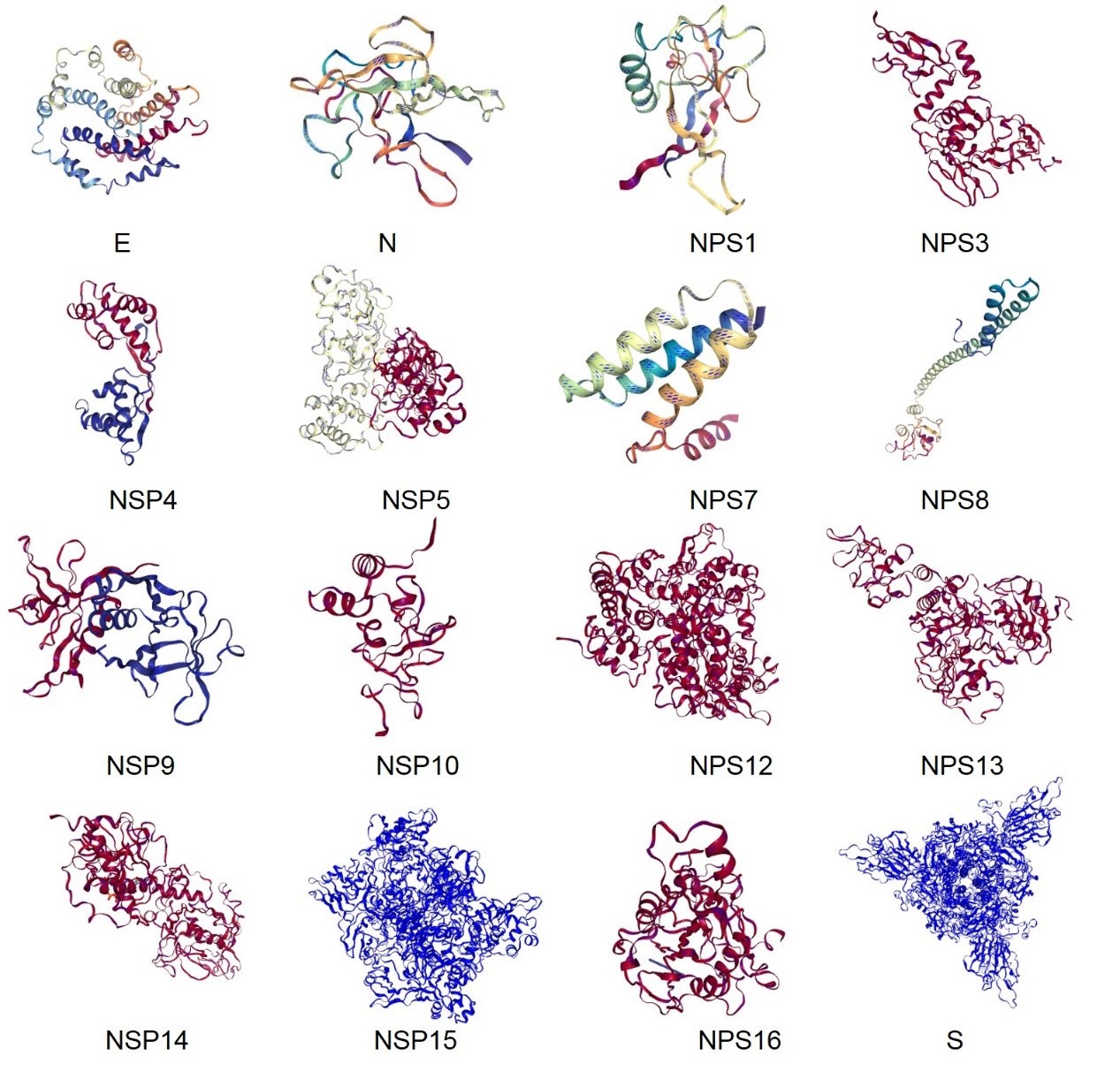 Of the 20 proteins of SARS-CoV-2 whose primary structures have been modeled, 15 have high homology compared with SARS-CoV proteins, and the identities are over 70%. The 3D spatial conformation of these proteins is similar to that of template proteins.