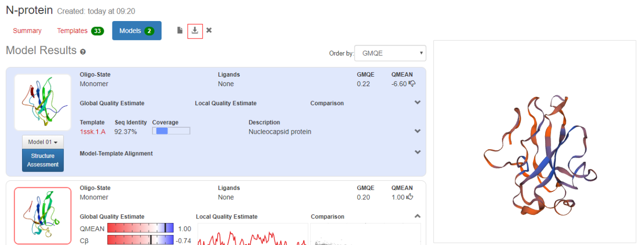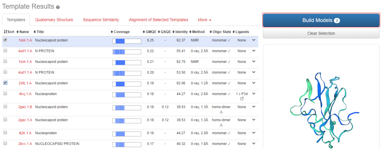 After selecting the optimal template protein, click Build Models on the page to automatically perform single-sourcing modeling. For proteins with short sequences (<100 residues), the process usually takes a few minutes. For proteins with a long sequence (>1000 residues), the process usually takes about 20 minutes. After the modeling is completed, the 3D spatial structure of the template and target proteins can be directly downloaded for subsequent analysis.