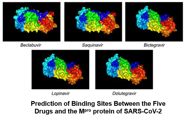 The results show that five drugs can bind well with the Mpro protein. They are Beclabuvir, Saquinavir, Bictegravir, Lopinavir, and Dolutegravir. Beclabuvir, ranking No. 1 in the list, is the inhibitor of the RNA polymerase NS5B on which the RNA of the hepatitis C virus (HCV) depends. The RNA polymerase NSP12 of SARS-CoV-2 has a similar thumb-like conformation in the active site as that of the HCV NS5B. Therefore, in addition to binding with the Mpro protein, Beclabuvir may also be a potential inhibitor of NSP12. Saquinavir (No.2) and Lopinavir (No.4) can bind well not only with the Mpro protein, but also with the S-protein of SARS-CoV-2, thereby preventing the binding of the S-protein with the ACE2 receptor (figure 2). As a result, the virus can be prevented from spreading both inside and on the surface of the cells. According to medical media reports, China Clinical Trial Registry now includes Lopinavir in the list of new clinical trials of SARS-CoV-2. Bictegravir (No.3) and Dolutegravir (No.5) are inhibitors of the HIV integrase. By inhibiting integrases, they suppress viral replication.