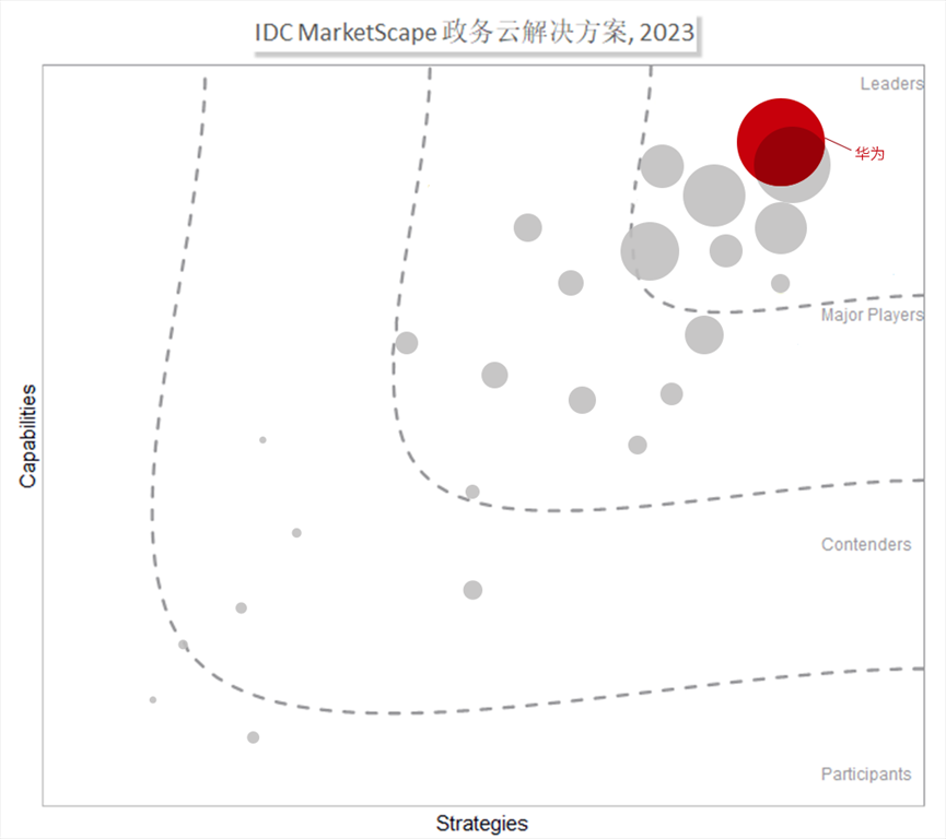 IDC, a world-leading provider of IT market research and consulting services, released the IDC MarketScape: China Government Cloud Solution 2023 Vendor Assessment report recently. The report provides a comprehensive assessment of the competitive fitness of 24 solution providers in China's government cloud market. For the third time in a row, Huawei Cloud has been named as a Leader* in this report and has been positioned ahead all other vendors in terms of market share and the "capabilities" score, which reaffirms Huawei's years of technical expertise and extensive practices.
