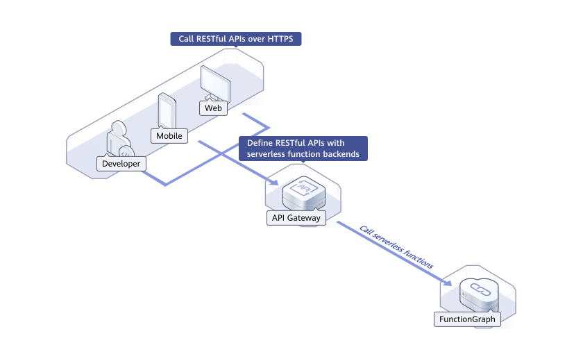 Create and bind RESTful APIs to run code without provisioning or managing servers.