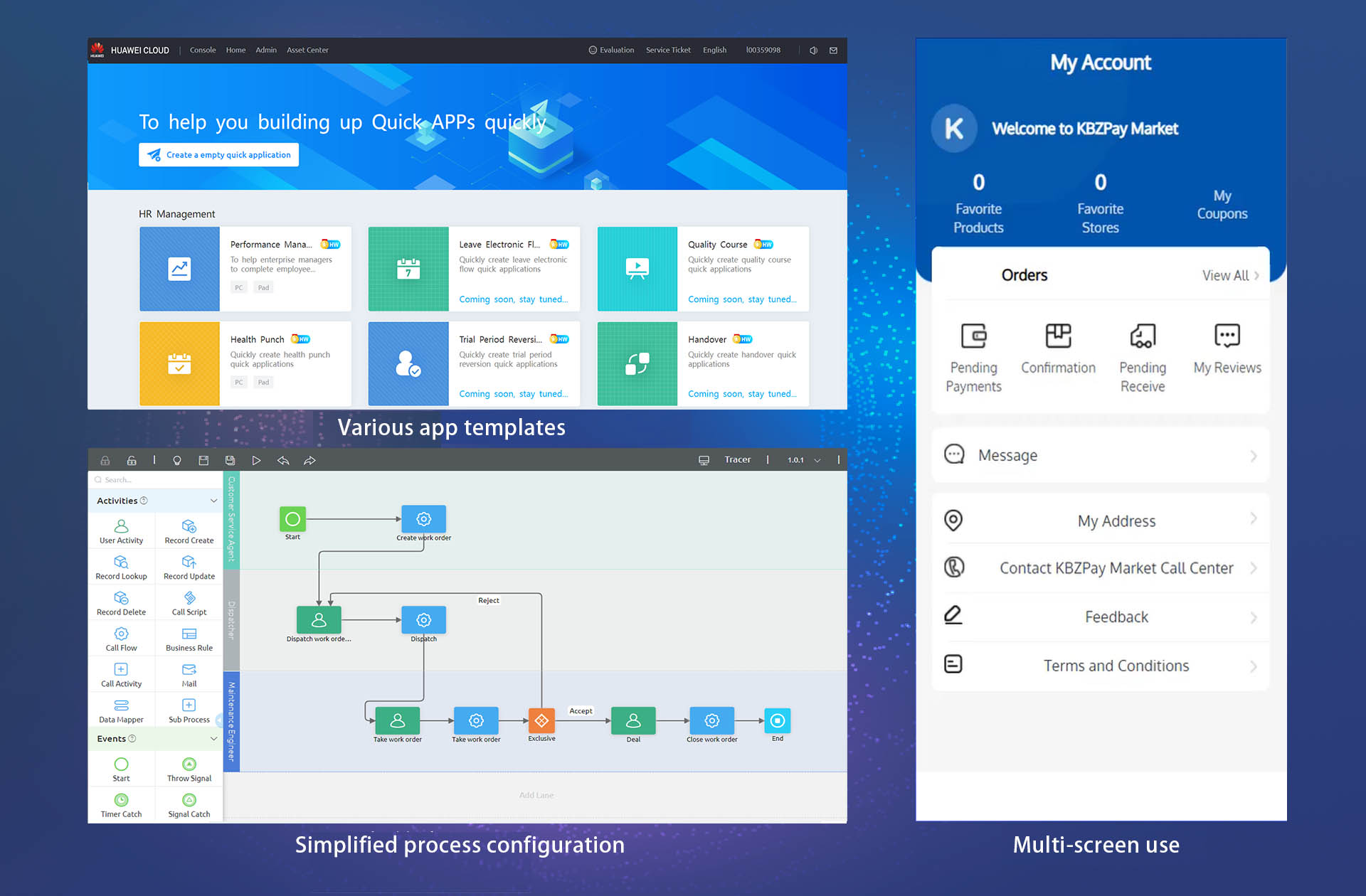 All-cloud online development in codeless or low-code mode, multi-terminal adaptation, visualized large-screen development, and graphical service orchestration reduce training costs and enable service personnel to develop apps.