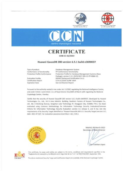 On March 8, 2022, the Huawei GaussDB 200 data warehouse, a.k.a Huawei Cloud GaussDB(DWS), was officially granted the CC EAL2 + ALC_FLR.2 — one of the most highly respected security certifications in the world.