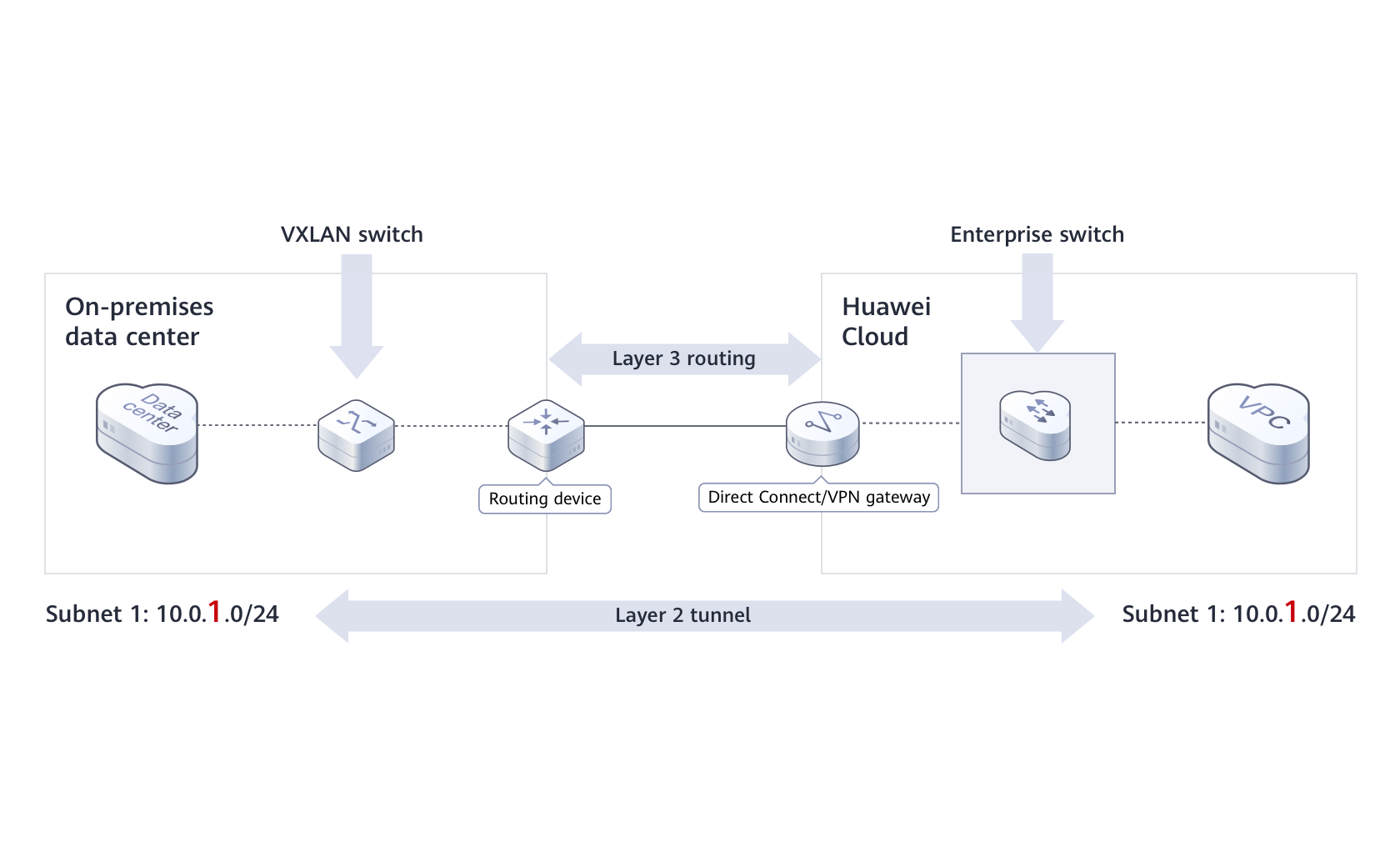 Enterprise switches enable communications between cloud and on-premises networks at Layer 2. This allows you to migrate workloads in data centers or private clouds to the cloud without changing subnets and IP addresses.