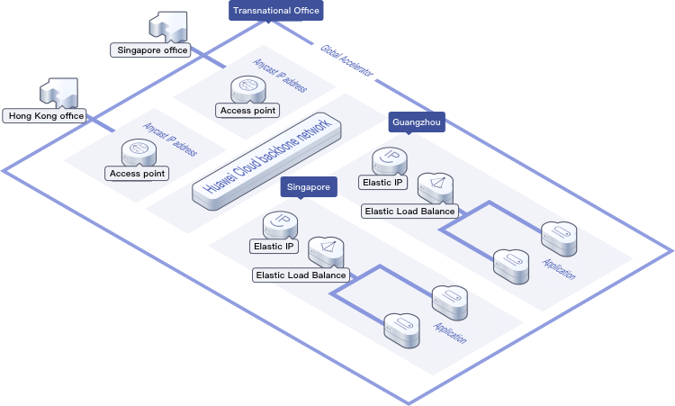 Multinational enterprises usually deploy applications at the headquarters for centralized O&M. Their global branches require high-speed access to those applications. Using Global Accelerator ensures consistently fast access.