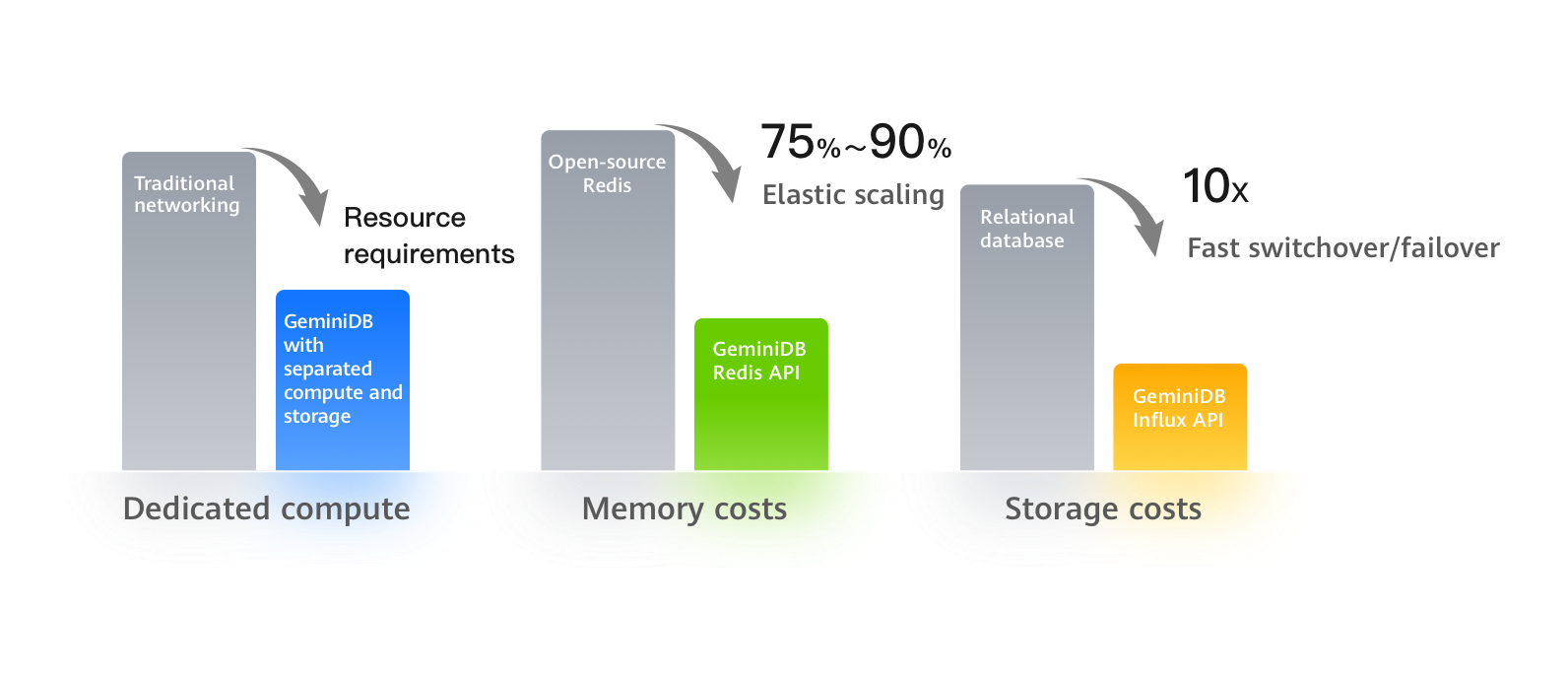 Low memory cost: GeminiDB Redis API has less demanding memory requirements than open-source Redis, which reduces hardware costs by as much as 75% to 90%.
