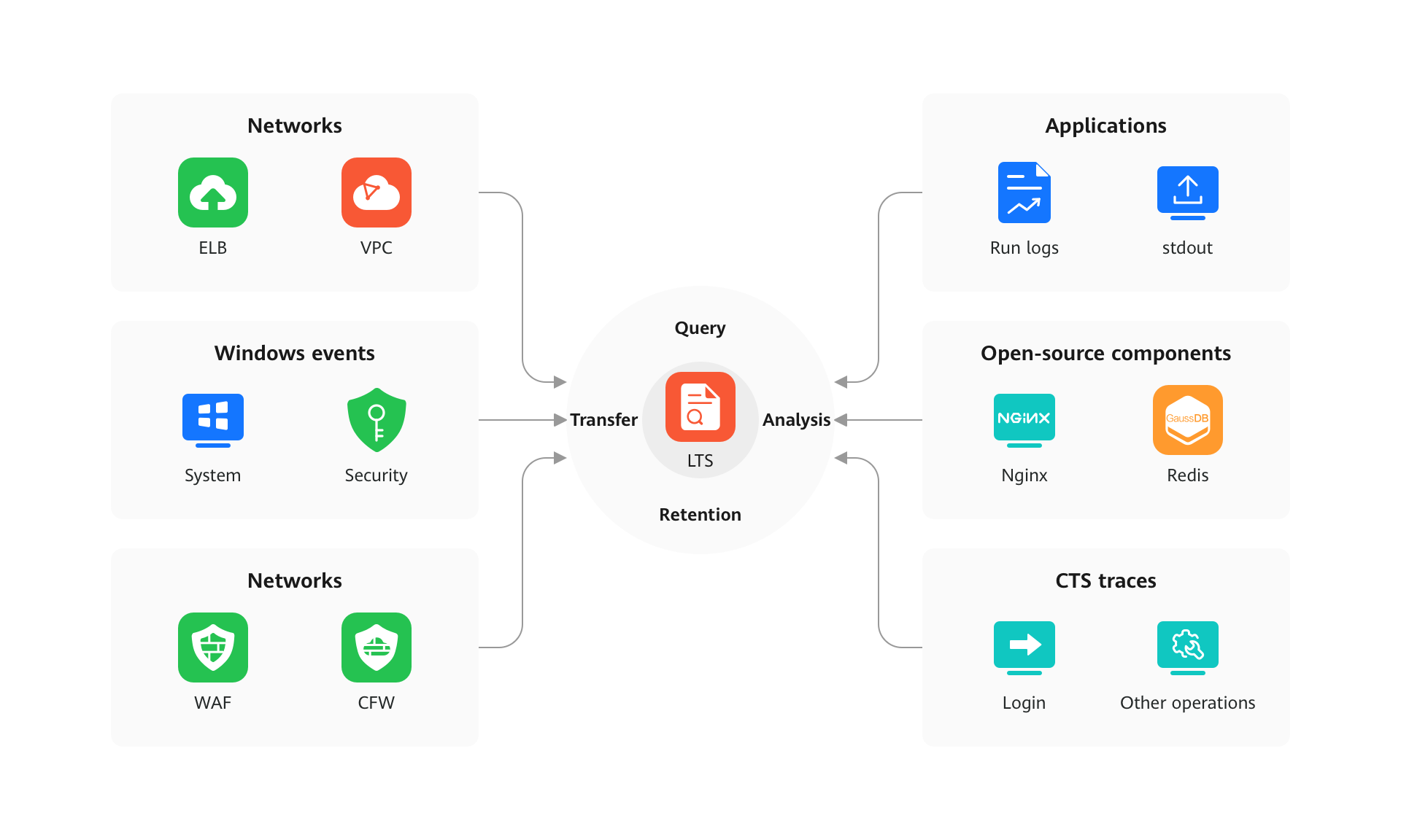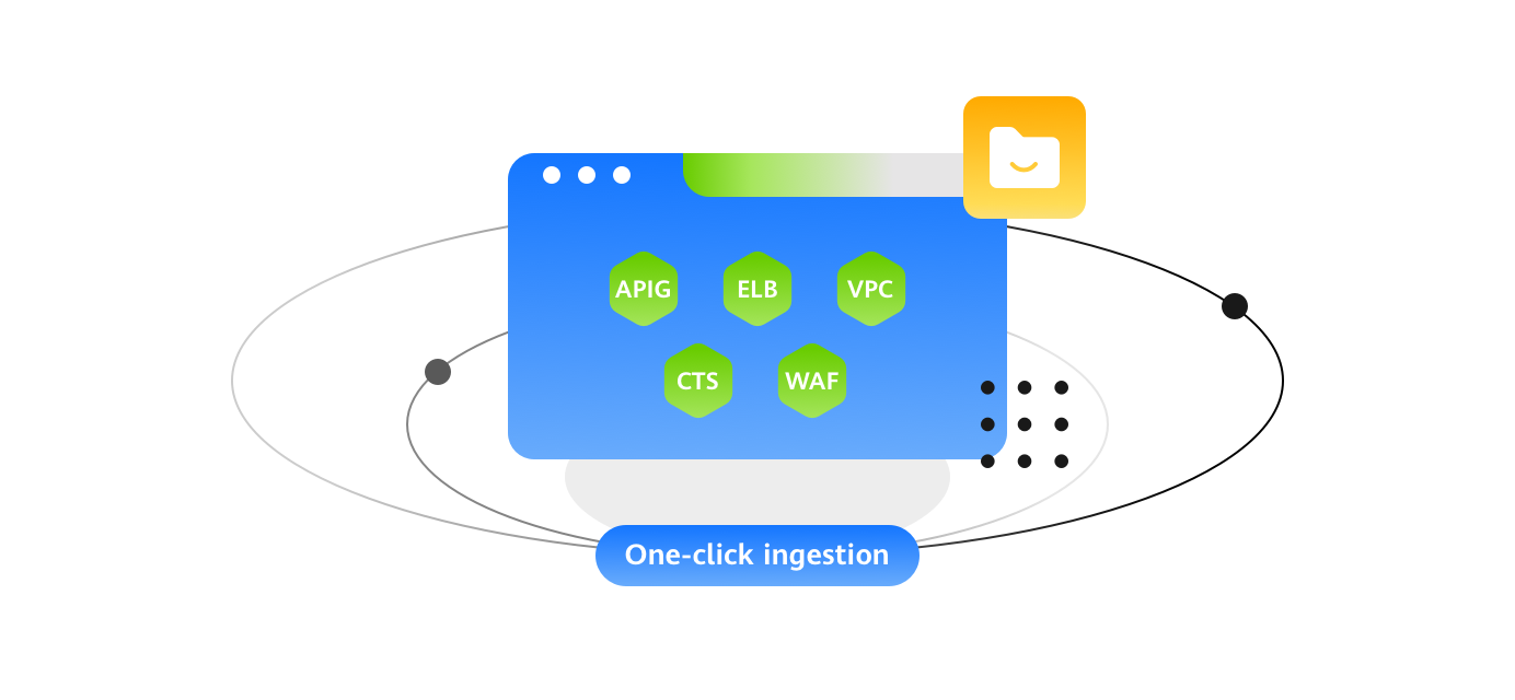 • One-click ingestion of 40+ cloud services to LTS, such as ELB, VPC, APIG, CTS, and WAF