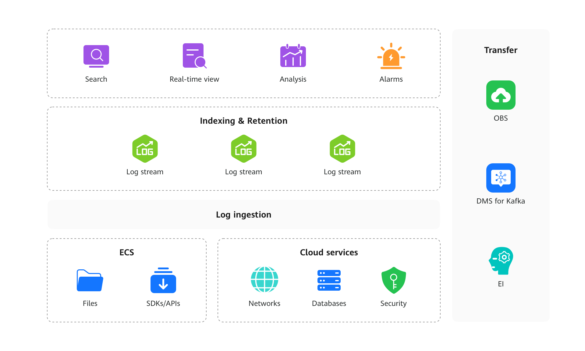 • Many log transfer destinations, such as OBS, DMS, and DWS
