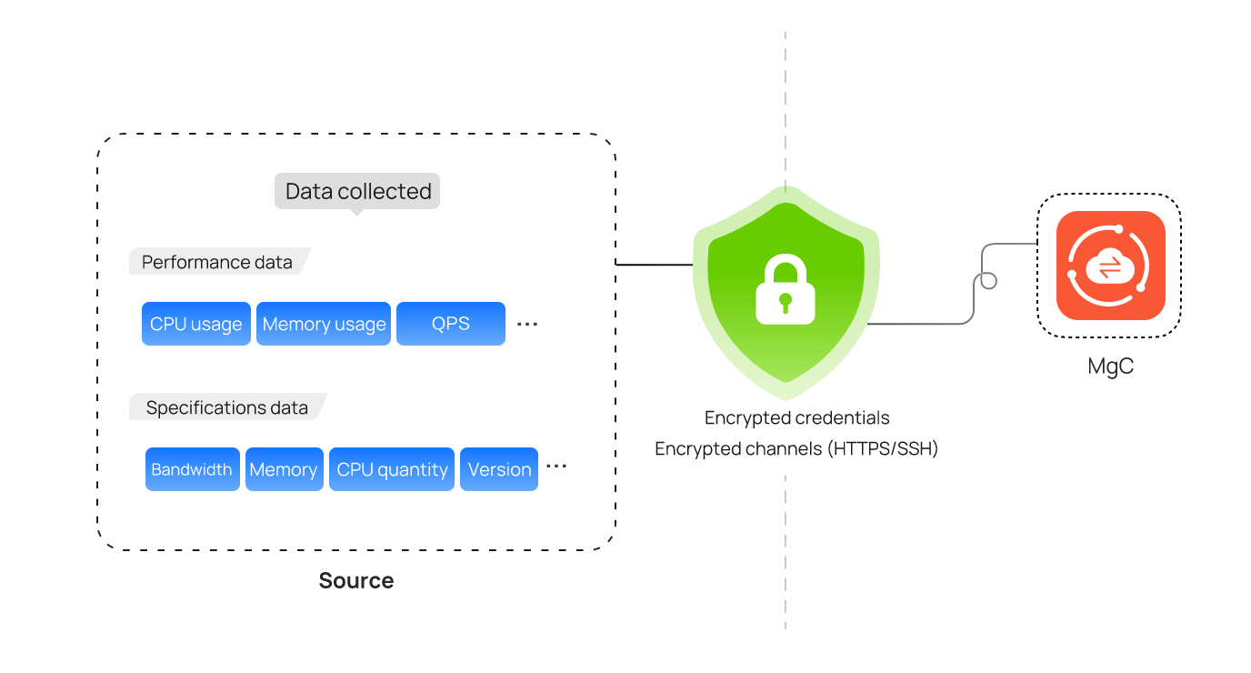 MgC encrypts the credentials required for resource discovery before storing them into the MgC database or your local servers.