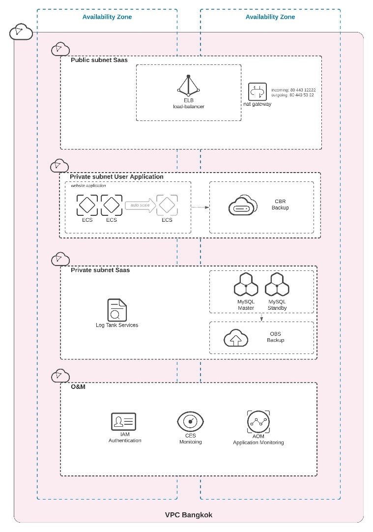 • The system architecture was redesigned before being migrated to HUAWEI CLOUD, considering the security and the support for possible scaling in the future Elastic Load Balancer (ELB) was, therefore, chosen to enhance security and flexibility in managing connections as well as to maximize the data security. Elastic Cloud Server (ECS) and Relational Database Service (RDS) were used to provide web services in diverse Virtual Private Network (VPC) zones. The customer configured security group rules in VPC to allow only specific access to necessary services.